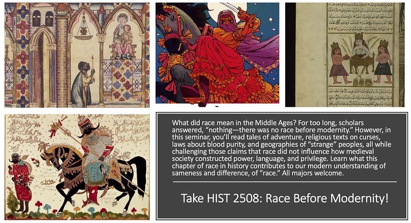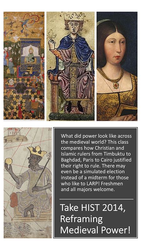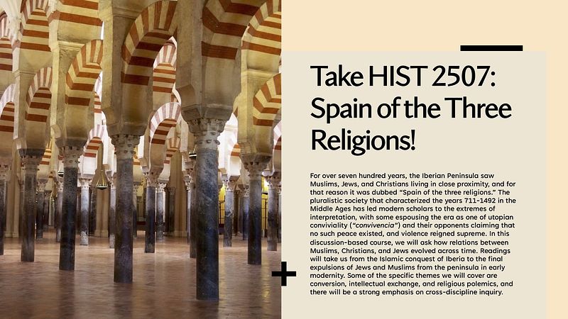 From Marrakesh to Madrid: Spain and North Africa, 700-1600: At its narrowest point, the Strait of Gibraltar separates the Iberian Peninsula from North Africa by less than eight nautical miles, and it follows that the histories of these two regions, its peoples, and Christianity and Islam are similarly enmeshed. This class delves into these interconnected and overlapping worlds across the medieval period from the Muslim conquests of Iberia to the early modern period, when King Philip III formally expelled those descended from Muslims from Spain. Within this long chronology, cosmopolitan societies flourished, empires rose and fell, identity was negotiated in text and art, and scientific advances were made. We will analyze rich and varied source materials to explore themes such as borderlands, social networks, diplomacy, gender, interfaith relations, and empire. We will meet heavily mythologized figures such as the Cid, Ibn Tūmart, and the Catholic Monarchs, and we will visit the halls of the Alhambra, the streets of Valencia, and the bustling city of Fez. While many travel guides to Spain focus on outdated concepts like Reconquest/Reconquista or interreligious coexistence/convivencia, or even blatantly erase the role of North Africa in Spain’s past, this class will invite students to explore a near-millennium long case study of entwined Christian-Muslim histories, and to challenge the limits of categories such as “European” and “African” in premodern culture, identity, and society.
